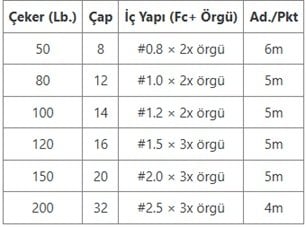 Yapı : 2 veya 3 tel fluorocarbon çekirdek + PE dış örgü